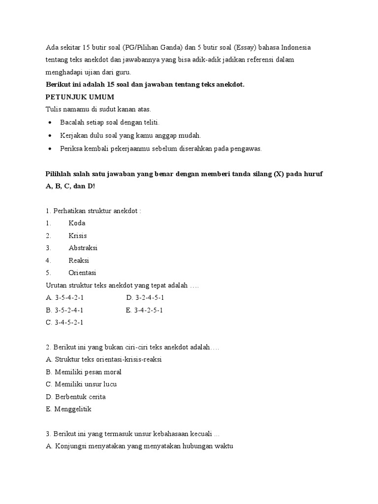 Level 5 kelas 9 10 konten. Bacalah setiap soal dengan teliti. Contoh soal teks anekdot pilihan ganda dan jawabannya. Petunjuk umum tulis namamu di sudut kanan atas. Teks yang berisi cerita singkat yang menarik karena lucu dan mengesankan. Contoh soal anekdot pilihan ganda dan jawaban ada sekitar 80 butir soal pg pilihan ganda pilgan bahasa indonesia tentang teks anekdot dan jawabannya yang bisa adik adik jadikan referensi dalam menghadapi ujian dari guru. Siswa mampu menunjukan struktur teks anekdot berdasarkan teks anekdot ada pada soal. Melangkah satu kaki kedepan b. Teks anekdot biasanya bertopik layanan publik, sosial, politik, lingkungan, dan sosial. Privatq.co.id contoh soal anekdot pilihan ganda dan jawaban ada sekitar 80 butir soal pg pilihan ganda pilgan bahasa indonesia tentang teks anekdot dan jawabannya yang bisa adik adik jadikan referensi dalam menghadapi ujian dari guru. Contoh soal anekdot pilihan ganda beserta jawaban.semoga bermanfaat bagi anda. Dalam kesempatan kali ini, saya akan membagikan contoh soal teks anekdot dalam dua bentuk. Yakni bentuk soal pilihan ganda (beserta jawabannya) dan soal esay.